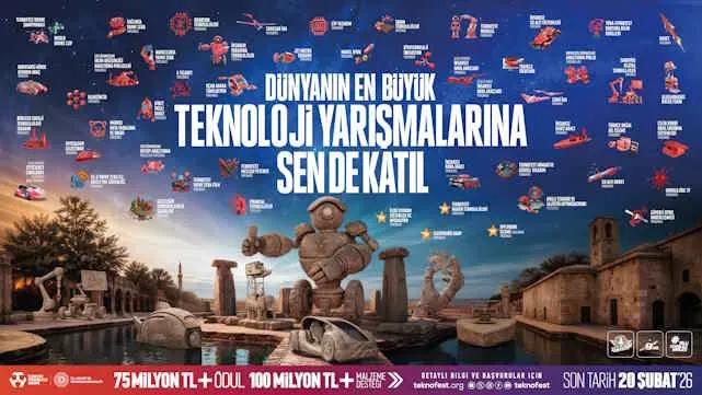 Dünyanın en büyük havacılık, uzay ve teknoloji festivali TEKNOFEST kapsamında düzenlenen 2026 yılı teknoloji yarışmalarına başvurular başladı. Bu yıl yeni adresi Şanlıurfa olan TEKNOFEST, 75 milyon TL ödül ve 100 milyon TL’den fazla maddi desteğiyle genç zihinleri yeni keşiflere davet ediyor. Fikirleri projeye, projeleri geleceğe dönüştürmek isteyenler için yarışma başvuruları 20 Şubat’a kadar devam ediyor!