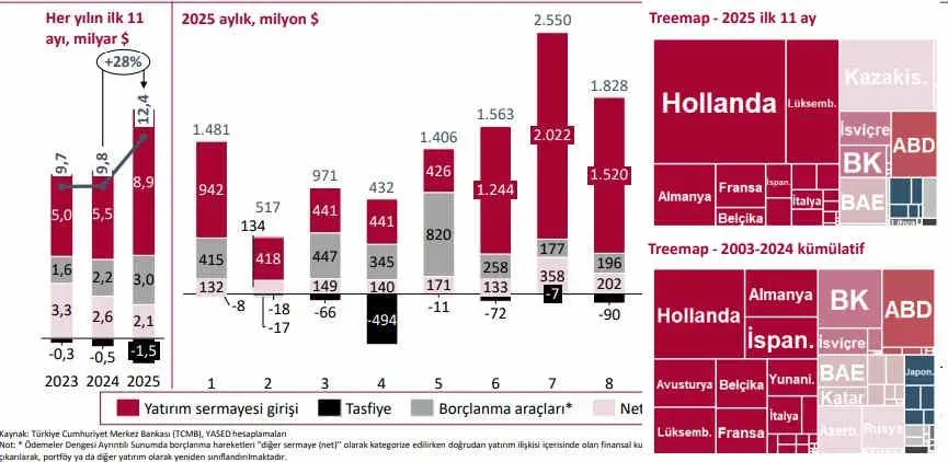 Güncel bu istatistikle beraber, yılın ilk 11 ayında Türkiye’ye gelen toplam UDY miktarı, 12,4 milyar dolara ulaştı. Yılın ilk 11 ayında 2024’ün aynı dönemine kıyasla yüzde 28’lik bir artış kaydedilirken 2003 yılından itibaren Türkiye’ye gelen UDY girişlerinin toplam değeri ise 286 milyar doları aştı.